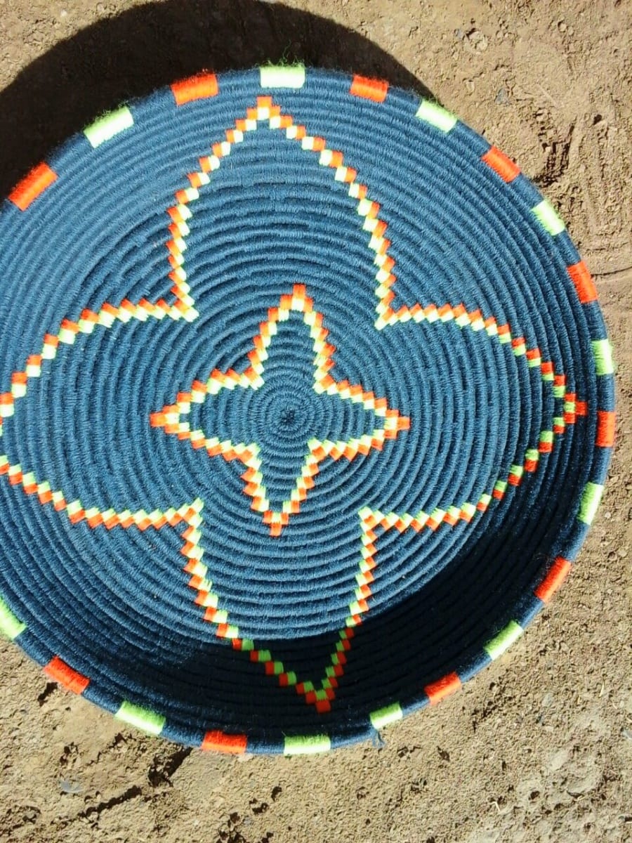 A traditional Moroccan basket known as a "tbaq." This basket is handmade using a local dried grass that is wound with colorful wool thread into one-of-a-kind designs. Originally these baskets were used for bread making but nowadays they can be functional or decorative.